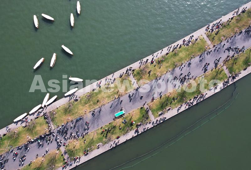 图片说明:2023年1月25日,从空中俯瞰游客在杭州西湖白堤上游览。