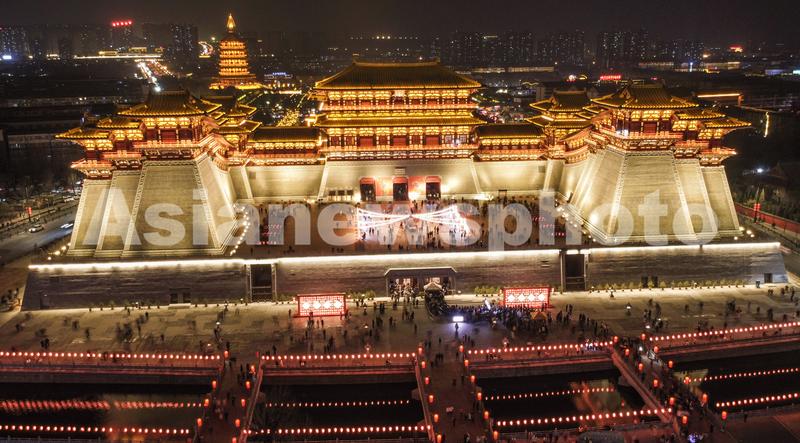 图片说明:2023年1月25日晚,游客在河南省洛阳市隋唐洛阳城国家遗址公园应天门遗址博物馆游玩休闲欣赏夜景。