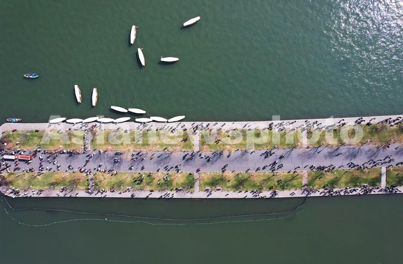 图片说明:2023年1月25日,从空中俯瞰游客在杭州西湖白堤上游览。