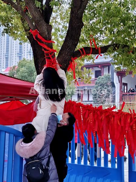 人们在归元寺里,进行了敬香、撞响祈福吉祥钟、数罗汉、树上糸许愿红色带、财宝天王殿前求神财敬财神等一系列丰富多彩活动,沉浸在欢声笑语中,呈现出一片欢乐喜庆兔年佳节的氛围。