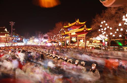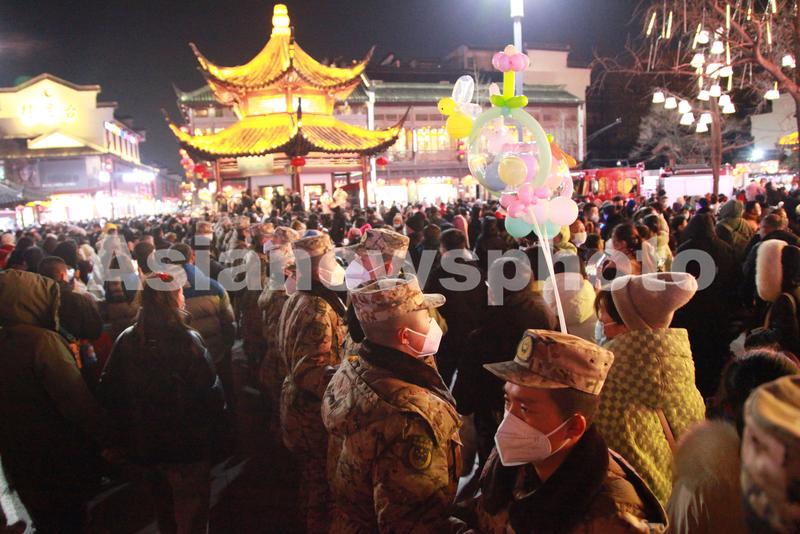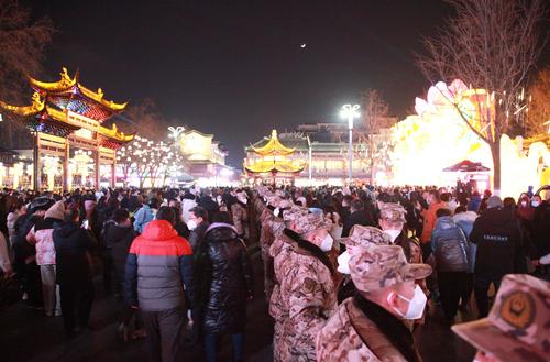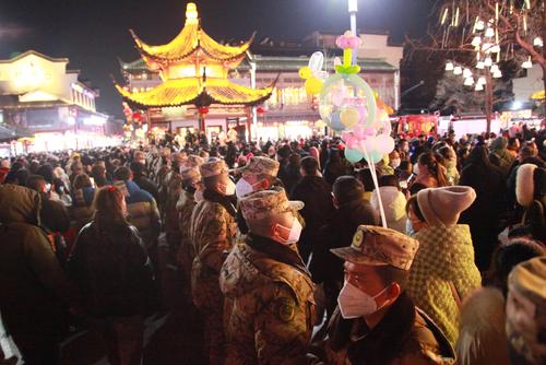2023年1月24日,江苏省南京市,为了有序疏导观灯客流,确保赏灯安全,武警官兵手挽手组成“人墙”,将赏灯人群分流,实行单向通行。