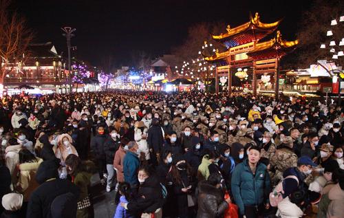 2023年1月24日,江苏省南京市,当日是大年初三,夜幕降临,游人前往南京夫子庙景区赏灯游玩。为了有序疏导观灯客流,确保赏灯安全,武警江苏总队南京支队官兵手挽手组成“人墙”,将赏灯人群分流,实行单向通行。