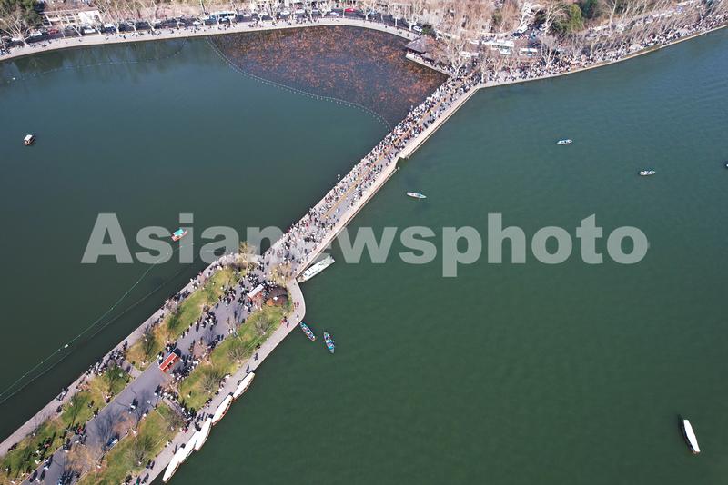 图片说明:2023年1月25日,从空中俯瞰杭州西湖断桥上的人潮。