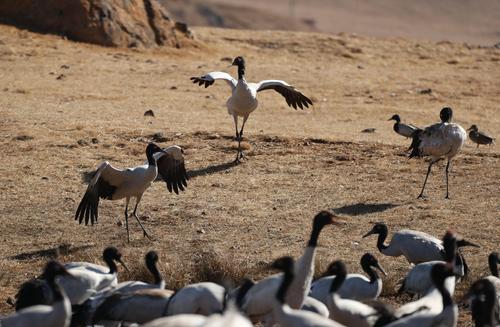 图片说明:2023年1月25日,南省昭通市昭阳区大山包镇车路村,黑颈鹤翩翩起舞。
