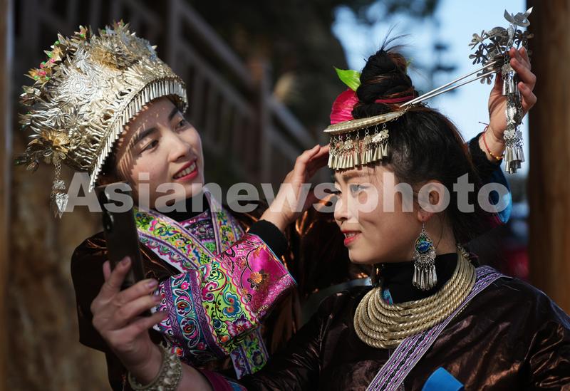 图片说明:2023年1月27日,在广西融水苗族自治县安太乡元宝苗寨,一位苗家女为同伴打扮,为参加“打同年”做准备。
