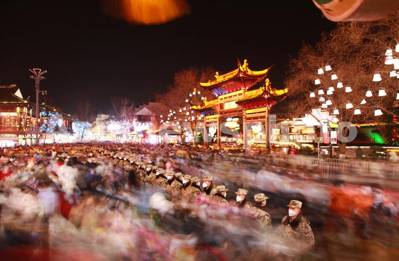 2023年1月24日,江苏省南京市,为了有序疏导观灯客流,确保赏灯安全,武警官兵手挽手组成“人墙”,将赏灯人群分流,实行单向通行。