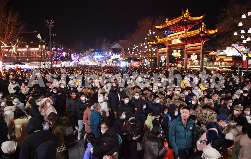 2023年1月24日,江苏省南京市,为了有序疏导观灯客流,确保赏灯安全,武警官兵手挽手组成“人墙”,将赏灯人群分流,实行单向通行。