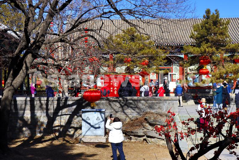 图片说明:2023年1月29日,游客们在颐和园畅观堂梅花展览现场欣赏拍照。