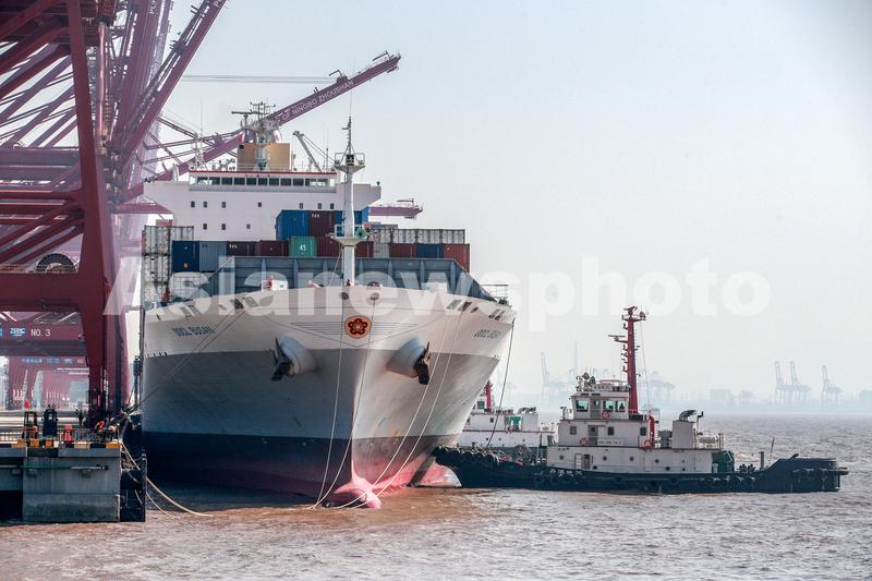2023年1月28日,东方釜山(OOCL BUSAN)轮完成作业后解缆离开宁波舟山港金塘港区大浦口集装箱码头1号泊位。