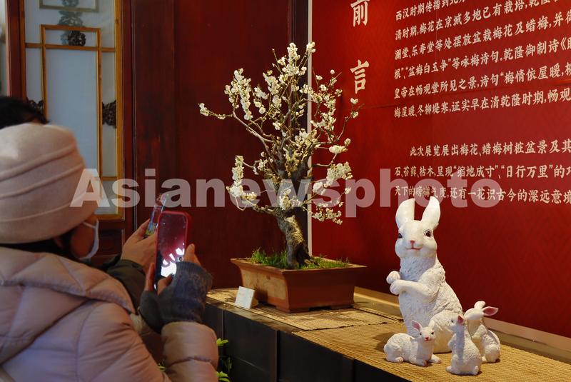 图片说明:2023年1月29日,游客们在颐和园畅观堂梅花展览现场欣赏拍照。