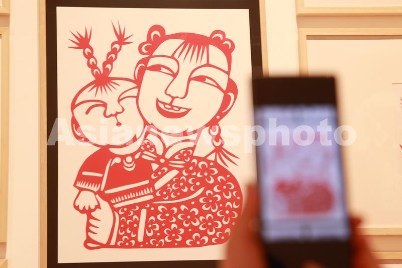 2023年1月29日,北京,观众在用手机拍摄剪纸作品。