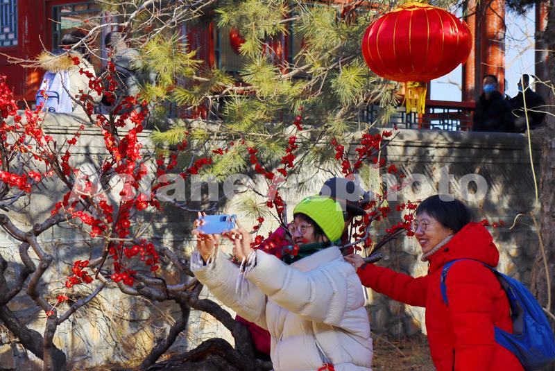 图片说明:2023年1月29日,游客们在颐和园畅观堂梅花展览现场欣赏拍照。