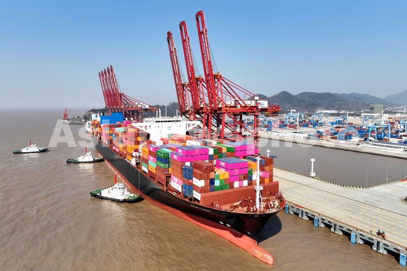 2023年1月28日,海洋网联宙斯(ZEUS LUMOS)轮又在三艘拖轮的护航下靠泊宁波舟山港金塘港区大浦口集装箱码头。
