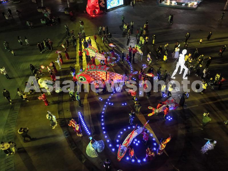 1月30日晚,人们在湖北省武汉市欢乐谷园区观看“汪满田鱼灯”表演。