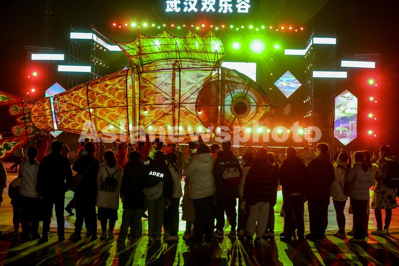 1月30日晚,人们在湖北省武汉市欢乐谷园区观看“汪满田鱼灯”表演。