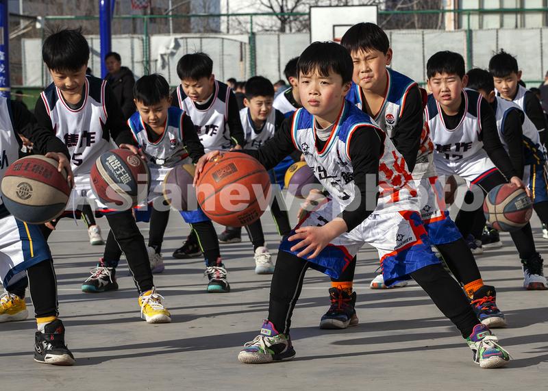 图片说明:1月31日,河南省焦作市博爱县体育馆,孩子们在进行原地运球比赛。