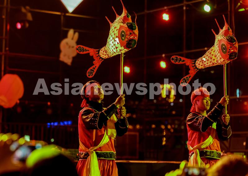 1月30日晚,民间艺人在湖北省武汉市欢乐谷园区为游客展示表演“汪满田鱼灯”。