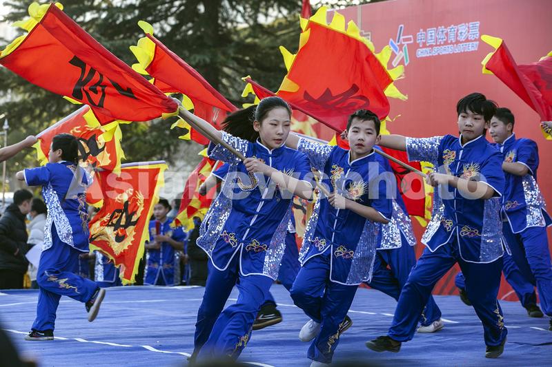 图片说明:1月31日,河南省焦作市博爱县体育馆,耀扬武术馆的队员们在进行武术比赛。