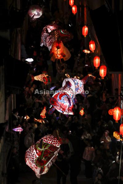 图片说明:2023年1月31日,在安徽省黄山市歙县,瞻淇鱼灯表演队伍正在村中嬉游祈福。