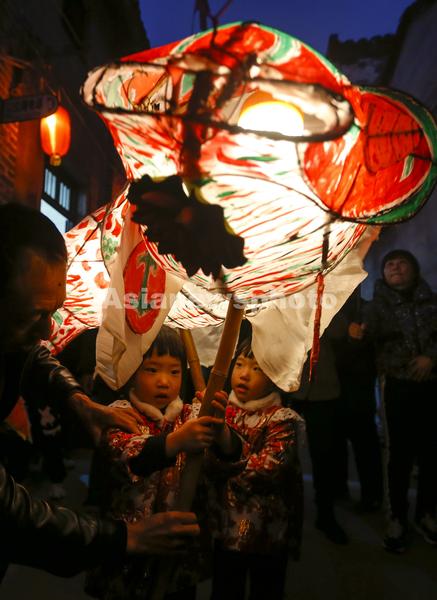 图片说明:2023年1月31日,游客在安徽省黄山市歙县瞻淇村体验嬉鱼灯。
