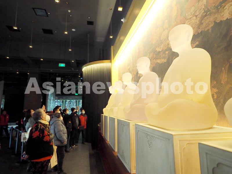 图片说明:2023年1月31日,观众在北京石景山区法海寺壁画艺术馆内参观。