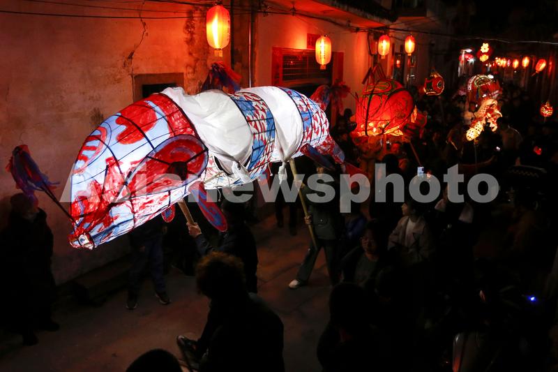 图片说明:2023年1月31日,在安徽省黄山市歙县,瞻淇鱼灯表演队伍正在村中嬉游祈福。