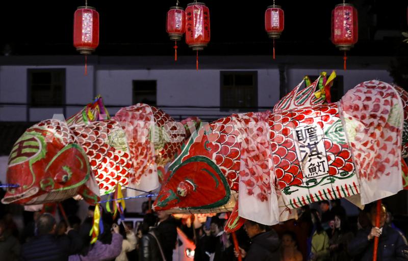 图片说明:2023年1月31日,在安徽省黄山市歙县,瞻淇鱼灯表演队伍正在村中嬉游祈福。