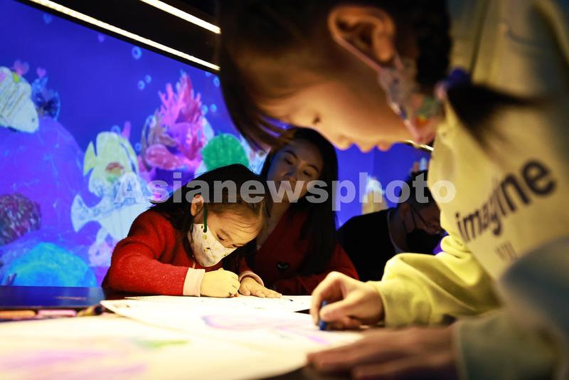 2023年2月1日,北京朝阳大悦城的无相艺术空间,小朋友在绘画体验沉浸式数字艺术空间。