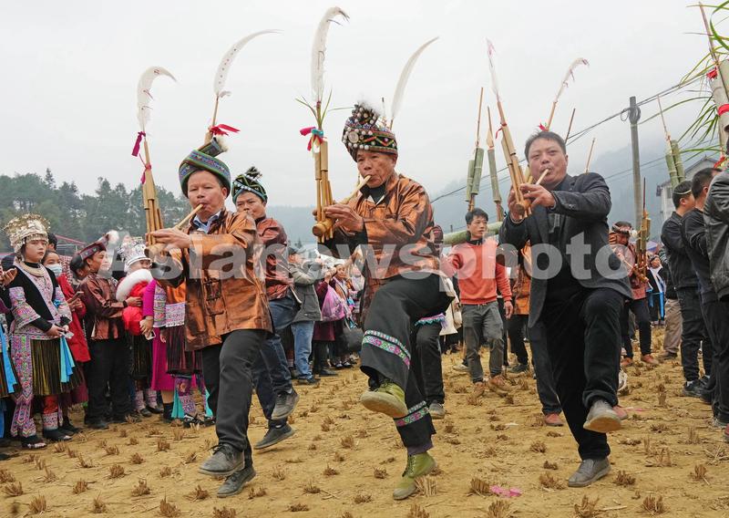 2023年2月1日,是广西柳州市融水苗族自治县安太乡元宝村正月十一坡会期,四乡八寨众乡亲汇聚一堂,开展芦笙踩堂、文艺表演和斗马等活动,喜闹新春,祈盼新年风调雨顺、五谷丰登。据了解,元宝村正月十一坡会是当地已列入第一批国家级非遗名录的“苗族系列坡会群”之一。