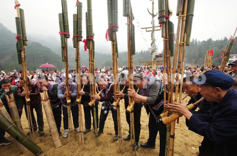 2023年2月1日,在广西柳州市融水苗族自治县安太乡元宝村,人们在吹奏芦笙。