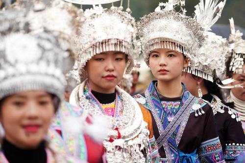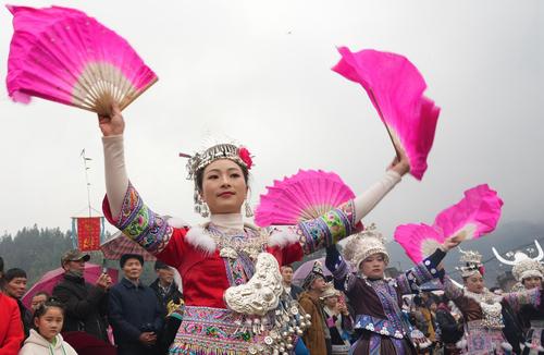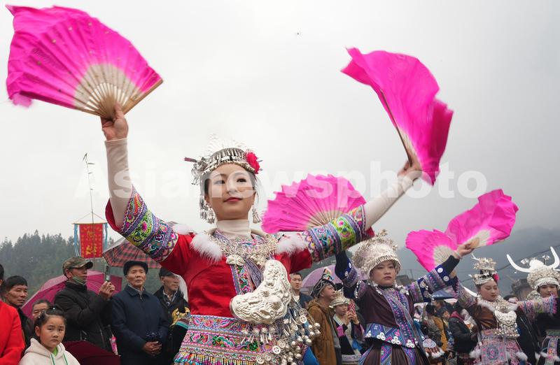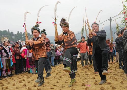 2023年2月1日,在广西柳州市融水苗族自治县安太乡元宝村,苗家女跳芦笙舞。