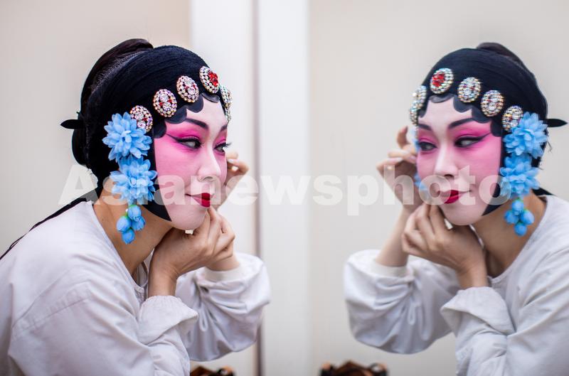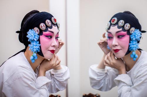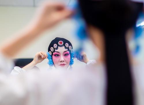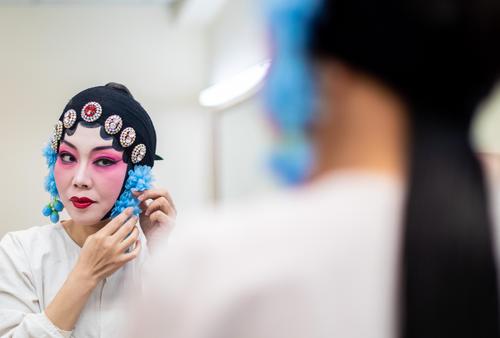 图片说明:2023年2月1日,呼和浩特市文化旅游投资集团晋剧院的演员在演出晋剧前化妆。