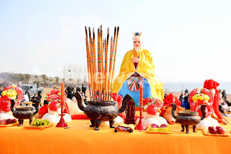 图片说明:2023年2月3日,山东省青岛西海岸新区琅琊镇台西头村祭海广场,祭海台上摆满了祭品。