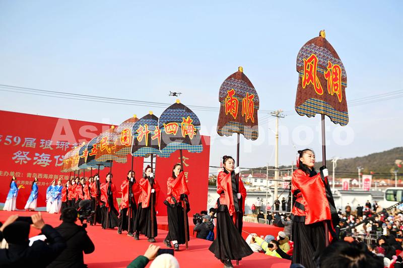 图片说明:2023年2月3日,山东省青岛西海岸新区琅琊镇台西头村祭海广场,祭海仪式进行中。