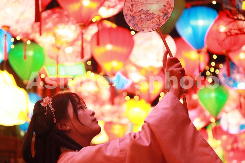 图片说明:2023年2月2日,江苏省南京市,一个女孩在南京老门东景区花灯下拍照留影。