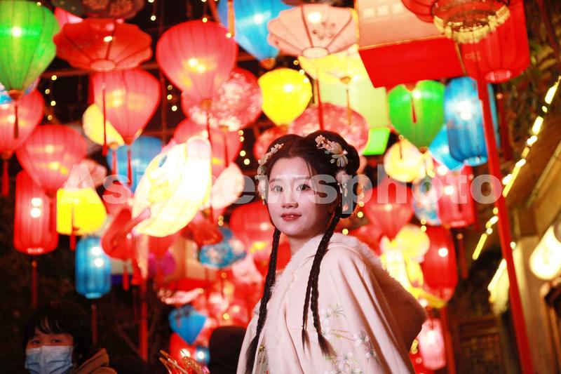 图片说明:2023年2月2日,江苏省南京市,一个女孩在南京老门东景区花灯下拍照留影。