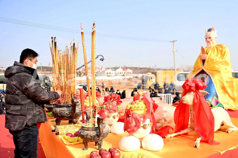 图片说明:2023年2月3日,山东省青岛西海岸新区琅琊镇台西头村祭海广场,渔民在祭海中上香。
