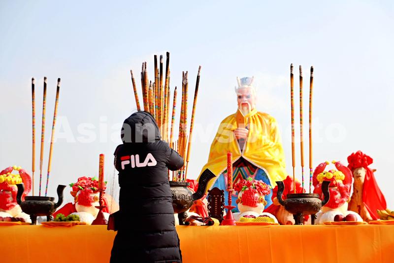 图片说明:2023年2月3日,山东省青岛西海岸新区琅琊镇台西头村祭海广场,一位游客在祭海中上香。