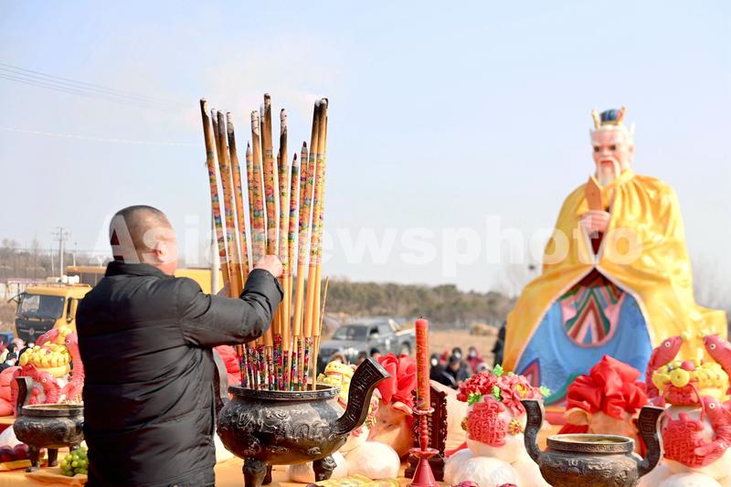 图片说明:2023年2月3日,山东省青岛西海岸新区琅琊镇台西头村祭海广场,渔民在祭海中上香。