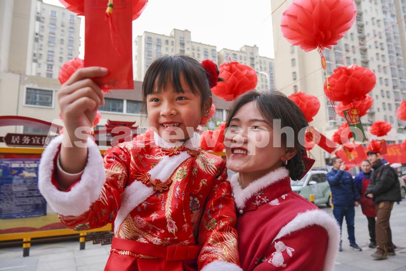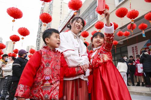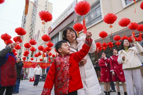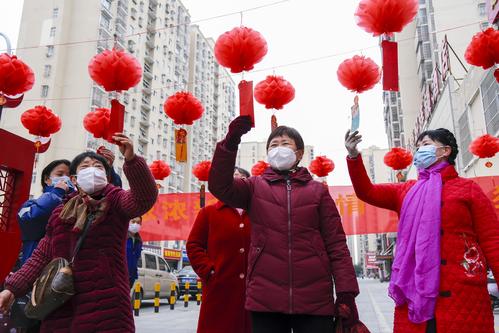 图片说明:2023年2月3日,在安徽省合肥市庐阳区林店街道连水社区,居民朋友们正在社区党群服务中心猜灯谜。