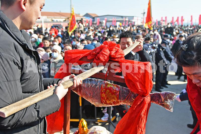 2023年2月4日,渔民在烟台黄渤海新区渔灯节祭海仪式上敬献祭品。