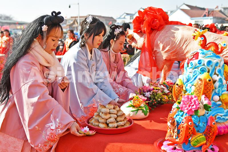 2023年2月4日,演员在烟台黄渤海新区渔灯节祭海仪式上敬献祭品。