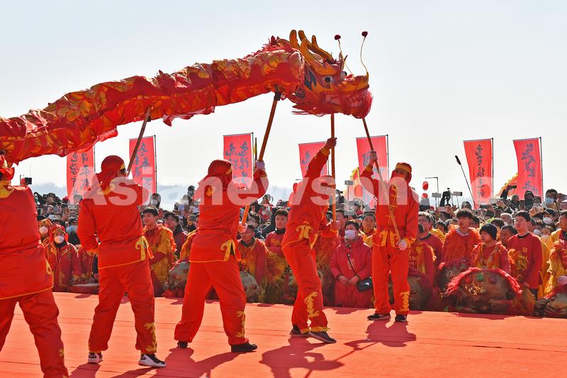 2023年2月4日,演员在烟台黄渤海新区渔灯节祭海仪式上表演舞龙。