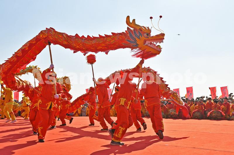 2023年2月4日,演员在烟台黄渤海新区渔灯节祭海仪式上表演舞龙。