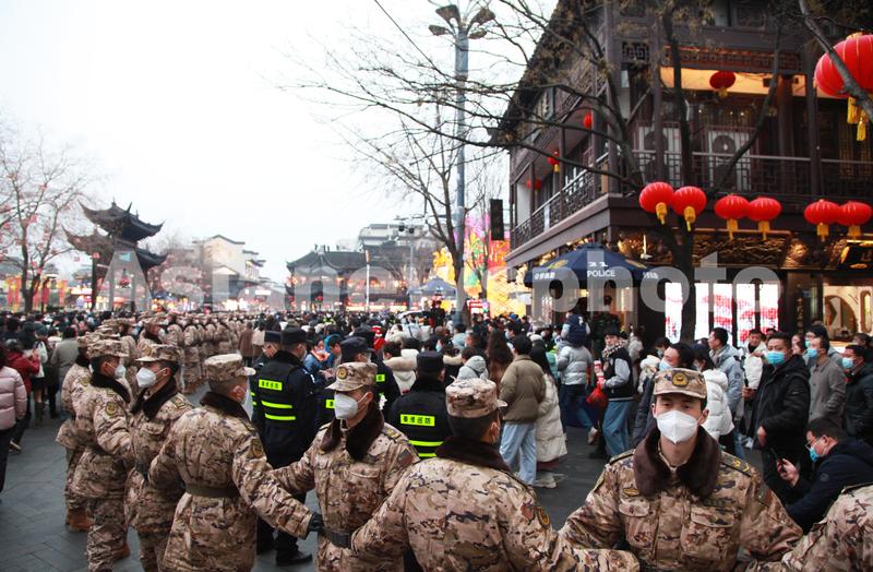 图片说明:2023年2月5日,江苏省南京市,当日是中国传统节日元宵节。夜幕降临,南京夫子庙景区灯火璀璨,游人如织,人们赏灯观景,欢度元宵佳节。武警官兵组成人墙,分流赏灯游客。