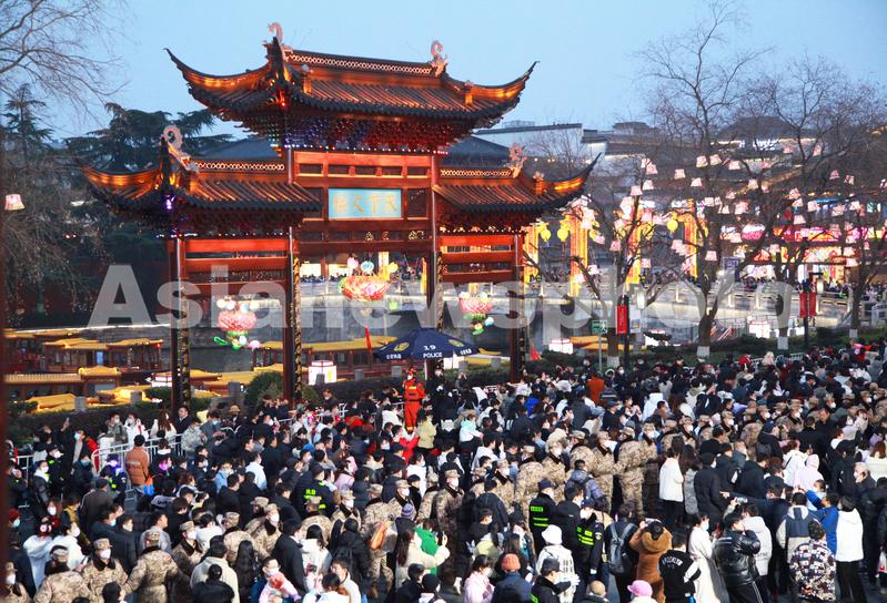 图片说明:2023年2月5日,江苏省南京市,游客在南京夫子庙景区赏灯观景。