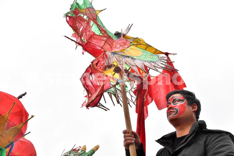 图片说明:2023年2月5日,画着花脸的舞龙队员在贵州省黔东南苗族侗族自治州锦屏县隆里古城“花脸龙”活动中举着龙头。