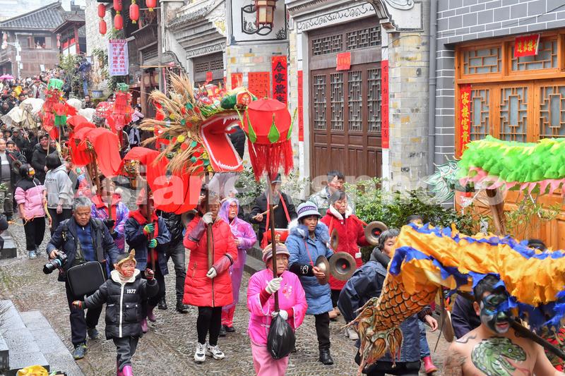 图片说明:2023年2月5日,画着花脸的舞龙队员举着彩龙巡游在贵州省黔东南苗族侗族自治州锦屏县隆里古城里。