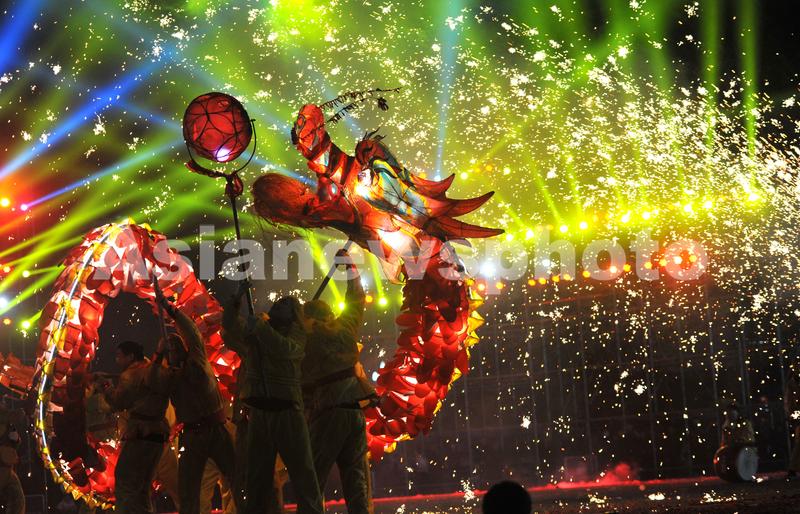 2023年2月4日,人们在贵州省台江县姊妹广场表演“舞龙嘘花”。
