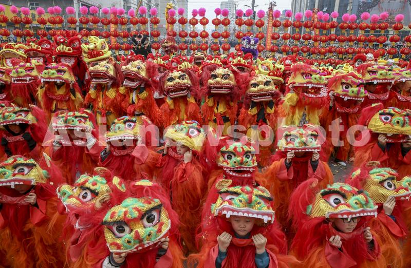 2023年2月5日,元宵节,山西省河津市举行“鱼跃龙门幸福河津”社火表演庆元宵,阳村街道办表演的《瑞狮闹春》。